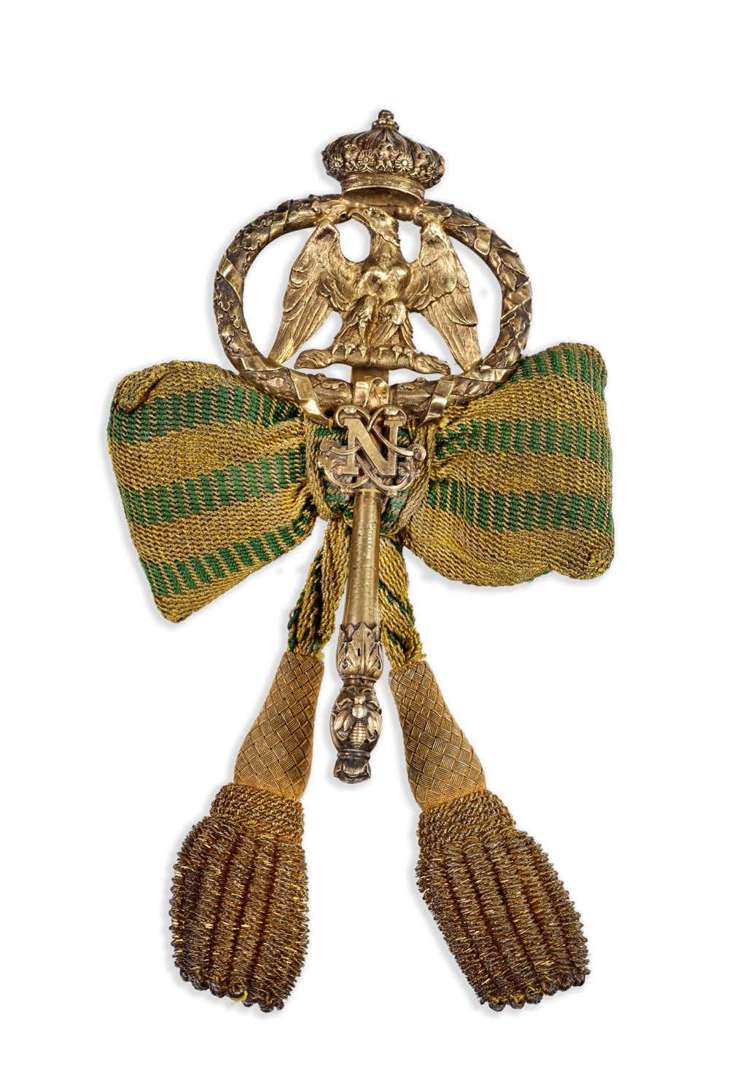 CLÉ DE CHAMBELLAN en bronze munit d'un crochet ovale sous couronne impériale dans lequel figure un aigle sur bâton de foudre. Clé garnie d'une abeille, de feuilles d'acanthe stylisées sur laquelle est aposé le chiffre «M». Complet de sa passementrie et de ses deux pompons. France, époque Second Empire