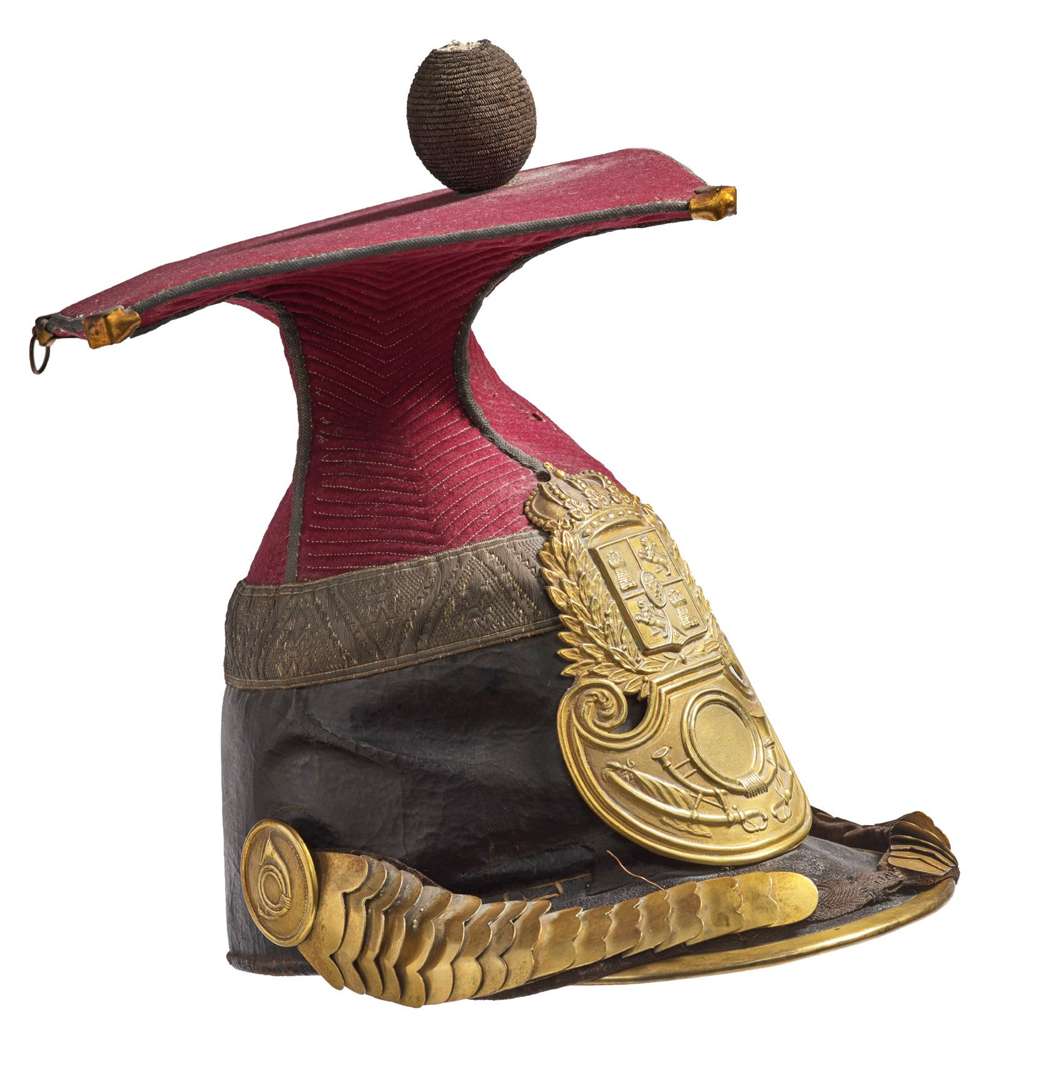 Plateau de forme carrée rouge en tissu gauffré serti de pièces de laiton aux extrémités, bandeau en cuir noir et gallon en passementerie argent à décor de fleurs de lys. Plaque en laiton estampée aux armes d'Espagne sous couronne et attributs des chasseurs. Visière à jonc en cuir, rosaces en laiton estampées aux cors de chasse, jugulaires en laiton à écailles doublées de velours noir. Coiffe en cuir noir à dents de loups. Olive présente, manque plumet. Ganse argent et cocarde rouge. Espagne, vers 1820-1830