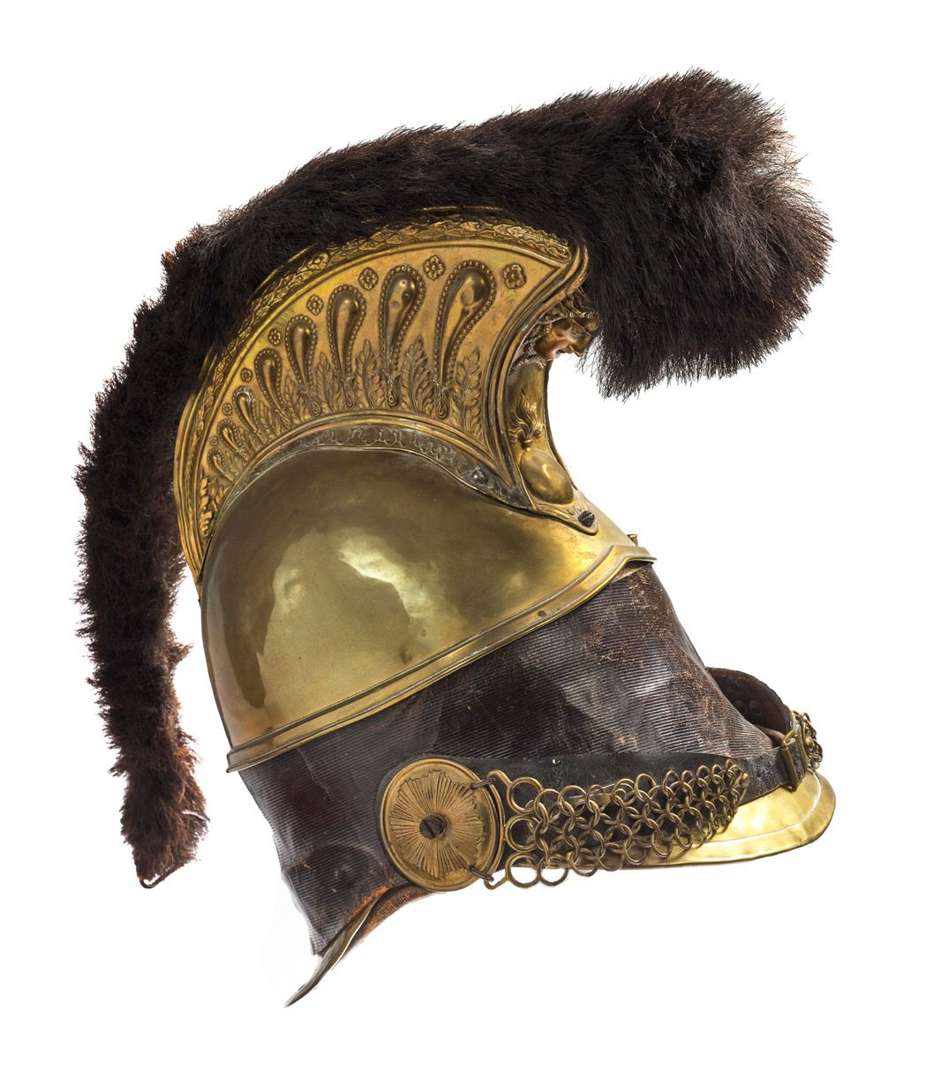 Transformé pour le service des pompiers, bombe et cimier en laiton, bandeau en cuir marron, rosaces en laiton timbrées au soleil rayonnant, jugulaire en cuir recouvert d'une suite de trois rangées de trois petits anneaux. La crinière et le marmouset ont été remplacés par une chenille pour le service dans les pompiers. Coiffe intérieure en cuir noir à dents de loup. France, époque Second Empire