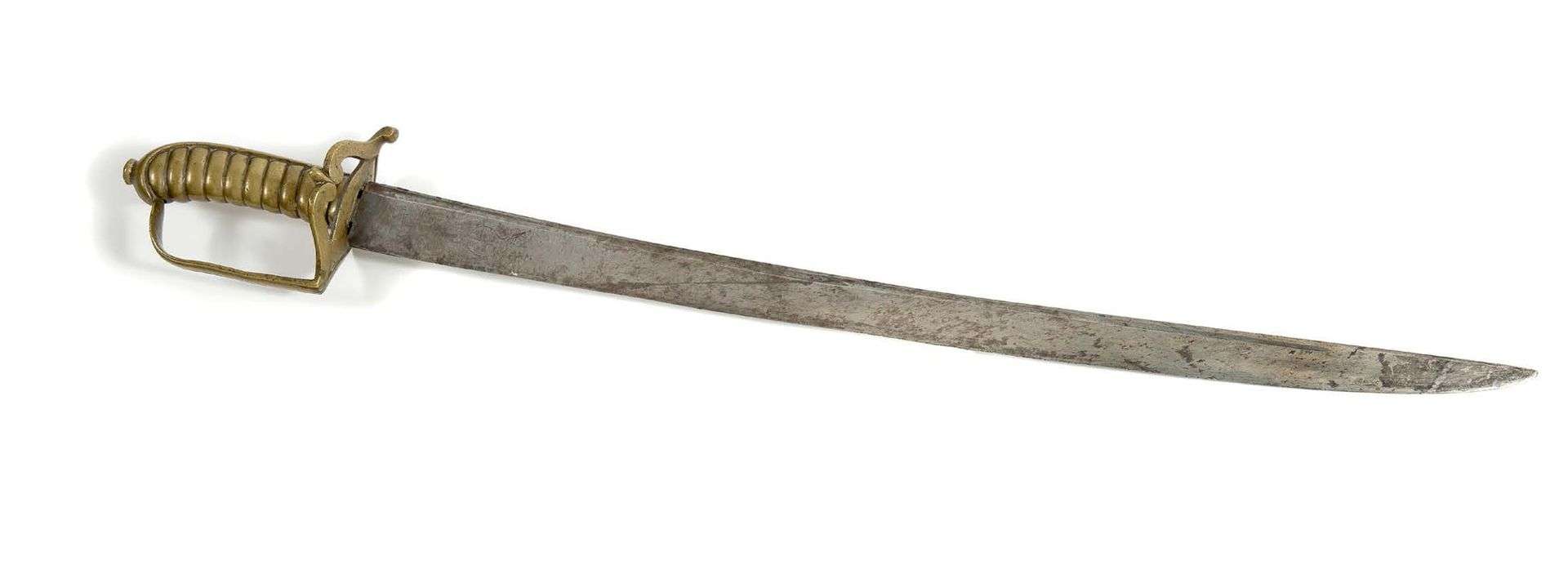 Monture en bronze à une branche de garde et petit plateau ajouré. Lame courbe à deux gouttières sur laquelle est gravée une grenade ainsi que «NADIER» de grenadier. France, époque fin de l'Ancien Régime