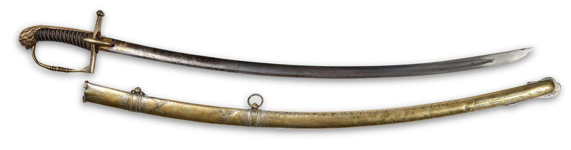 Monture en bronze à calotte à tête de lion, une branche de garde, quillon droit, croisière en amande, reste d'argenture. Fusée en bois couverte de cuir à double filigrane en métal cuivreux. Lame courbe à gouttière gravée et dorée au tiers, fabriquée à Solingen, cravate d'origine, quelques oxydations sur la lame. Fourreau en laiton avec reste d'argenture à deux bracelets décorés d'écails et de frises, flanqué de la toile d'araignée caractéristique des officiers fidèles à l'Empereur. Décors de palmes et de branches de lauriers, frise le long de la partie inférieure, une alternance de dorure et d'argenture au niveau du dard qui est en fer. Alaises en bois bien présentes, France époque Consulat. 101 cm (Usures et corrosion)