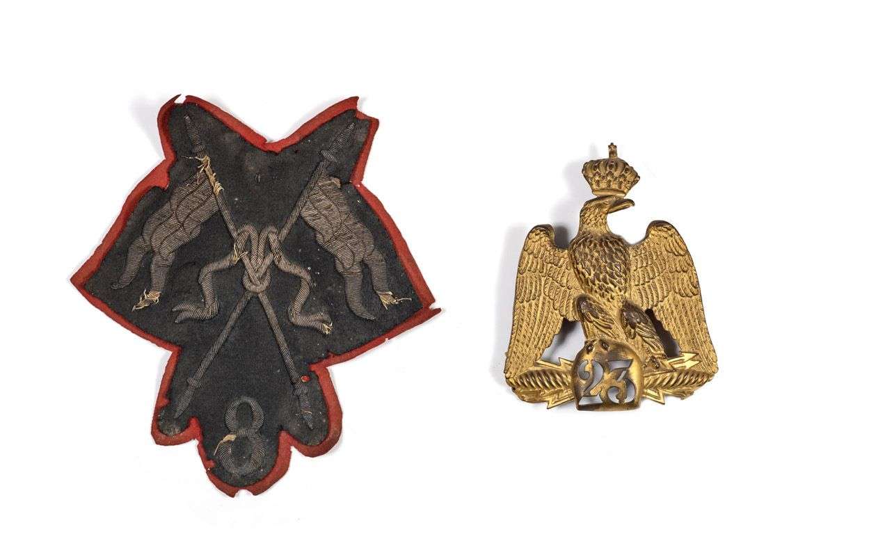 On y joint un parement de tapis de selle du 8e Lancier. Travail en passementerie argent sur tissu noir et rouge. France, seconde moitié du XIXe siècle