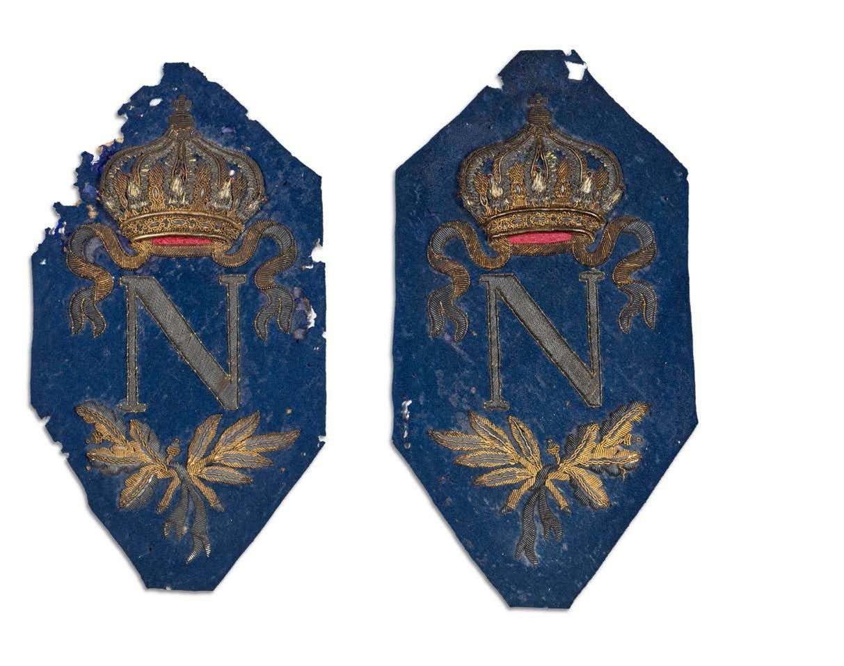Paire de parements de tapis de selle de la Garde Imperiale. Travail en passementerie or et argent sur tissu bleu, figurant le chiffre N sous couronne impériale. France, Epoque second Empire