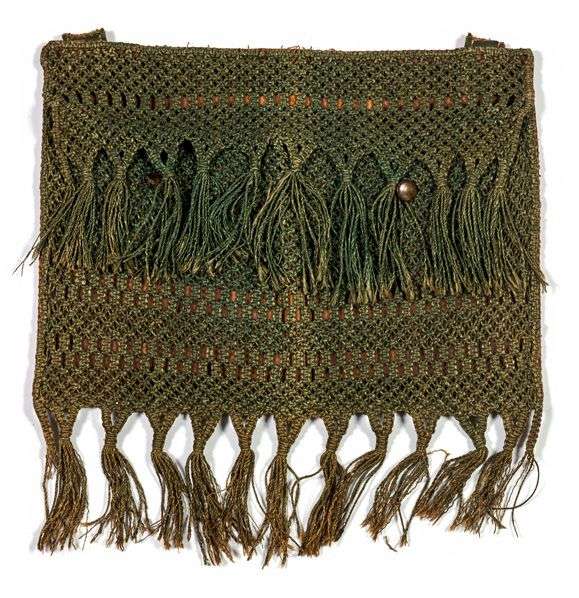GIBECIÈRE DE DONNÉE DUCHESSE D'ORLÉANS en cuir recouvert d'un tressage en fil de couleur verte, pour le petit gibier. Porte une étiquette : «Cet équipage de chasse a été donné le 1er janvier 1824 à (illisible) par S.A Royale Madame la Duchesse d'Orléans».