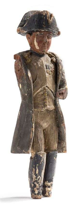 Sculpture en bois polychrome figurant Napoléon en tenue des chasseurs à cheval de la Garde. Probablement utilisé comme bougeoir car présence d'un trou au sommet de la tête. Travail français du XIXe siècle