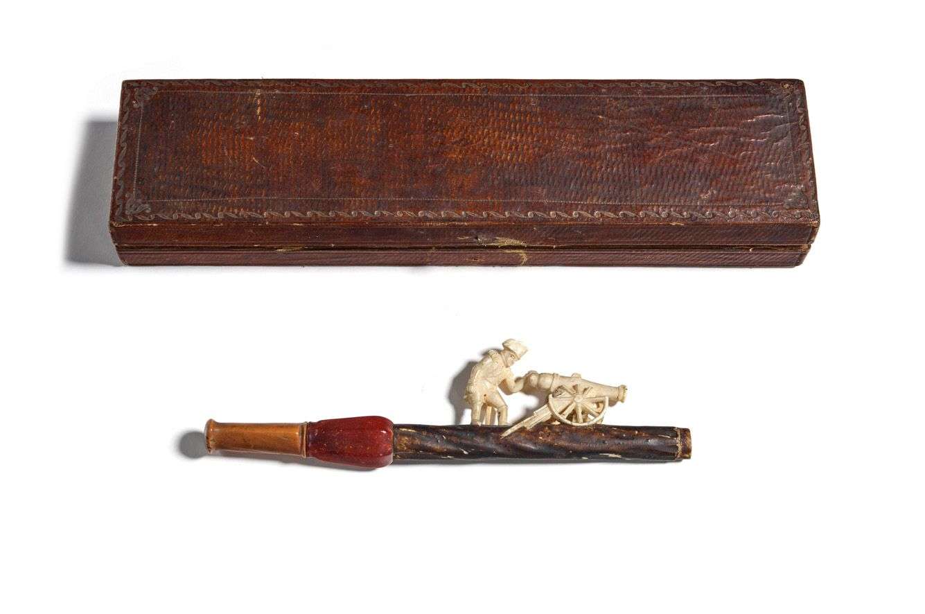 Fume cigarette avec tuyau en ivoire rudenté surmonté de l'Empereur Napoléon Ier réglant un canon, virole en ambre, embout en bois. Dans son écrin. Travail du XIXe siècle. Ancienne étiquette de collection n°210-211.