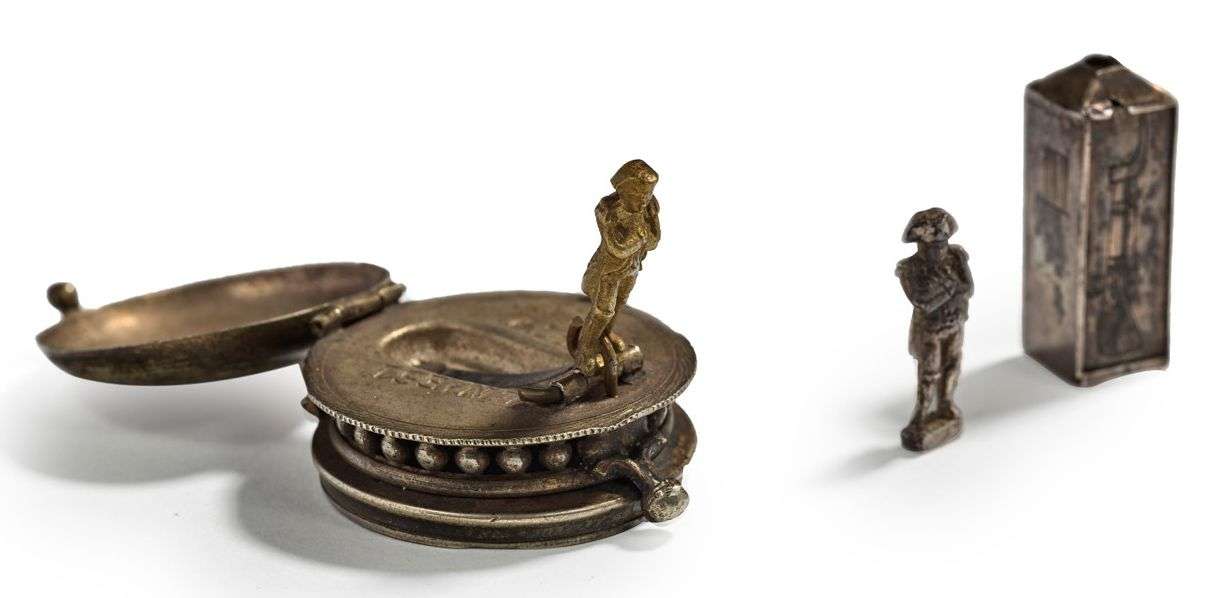 FOYER DE PIPE SÉDITIEUSE en métal doté d'un compartiment en son sommet renfermant un Napoléon monté sur ressort gravé «IL N'EST PLUS». Travail du premier tiers du XIXe siècle.