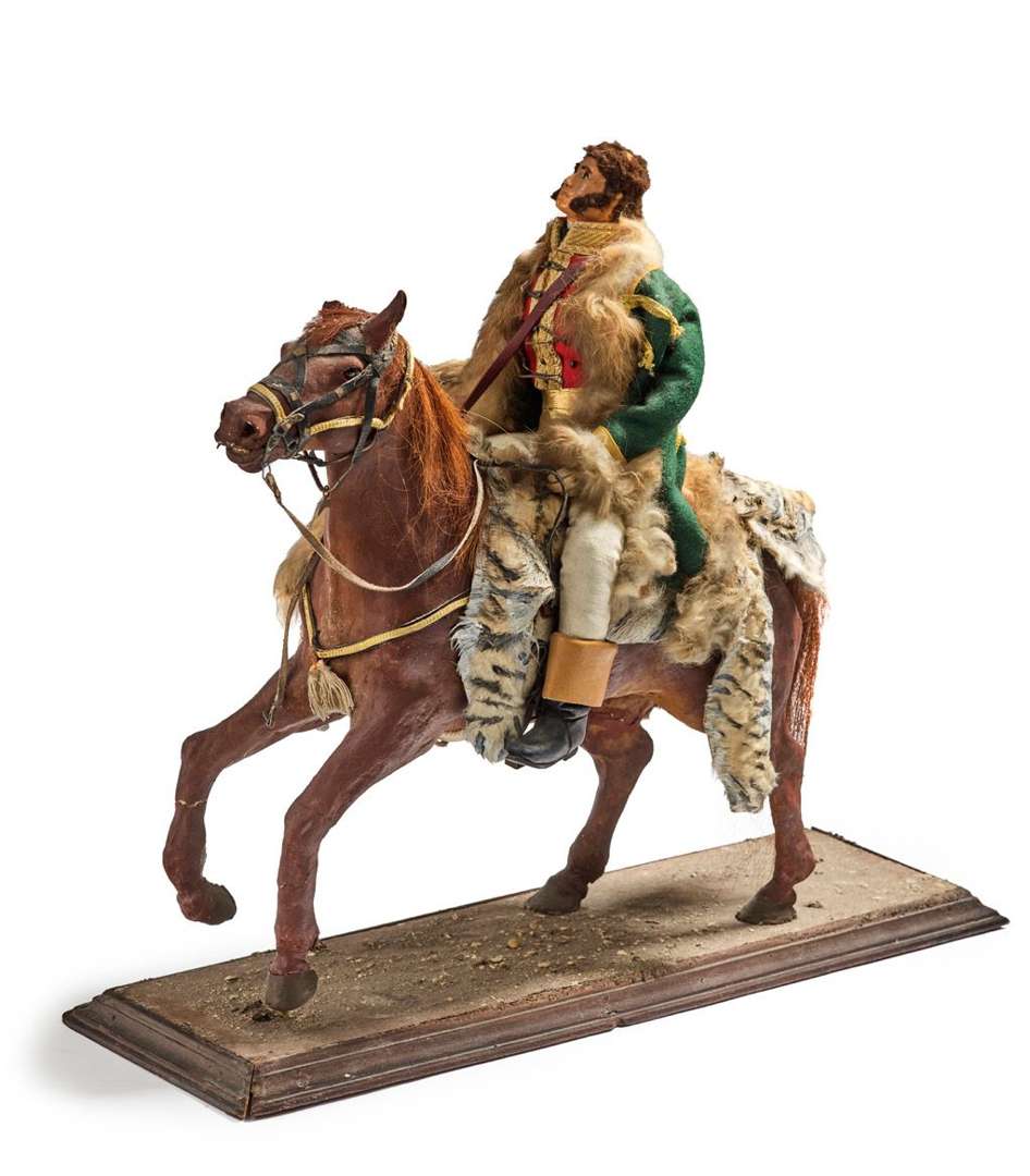 Figurine équestre de Murat, cheval en papier mâché peint, crin, selle en peau de lapin imitant une fourrure de tigre. Notre cavalier est également en papier mâché, tissu et fil doré.Socle en bois peint agrémenté de sable.Travail du XXe siècle