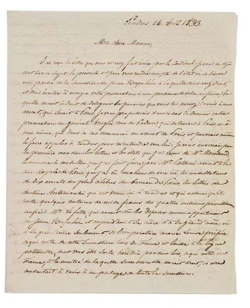 Copie de lettre Joseph Bonaparte pour sa mère, à Londres le 24 Avril 1833. Il est question d'une procuration que doit réaliser Madame Mère pour la succession de l'Aiglon (Napoléon II). Il est aussi évoqué brièvement la succession de l'Empereur. Joseph BONAPARTE détaille les relations qu'il entretien avec les plus grands avocats de Paris concernant les armes de l'Empereur. Le grand avocat de la cour Royale de Paris, Maître PATORNI est par exemple mentionné. ( 3 p. in-4 )