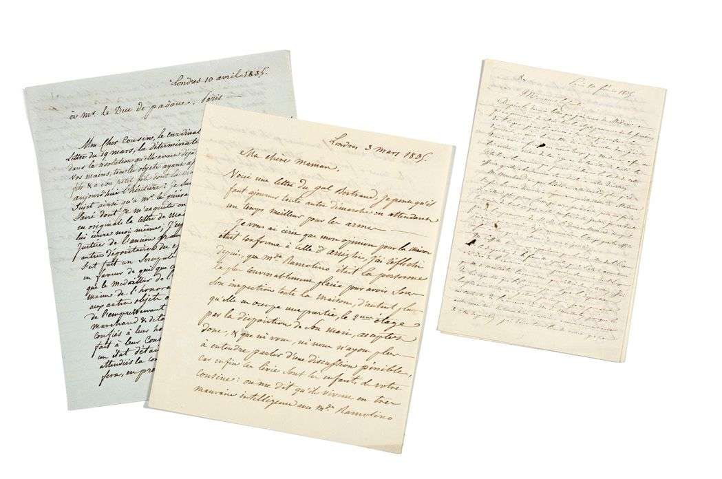 SUCCESSION DE L'EMPEREUR, SES ARMES, SA MAISON NATALE, MÉDAILLES, ARGENTERIE Copie d'une lettre de Joseph Bonaparte à sa mère et à son oncle, le Cardinal Fesch, Londres le 3 mars 1835. Il y est question d'attendre un temps «meilleur pour les armes» ainsi que de la maison natale de l'Empereur. (2P. in-4)