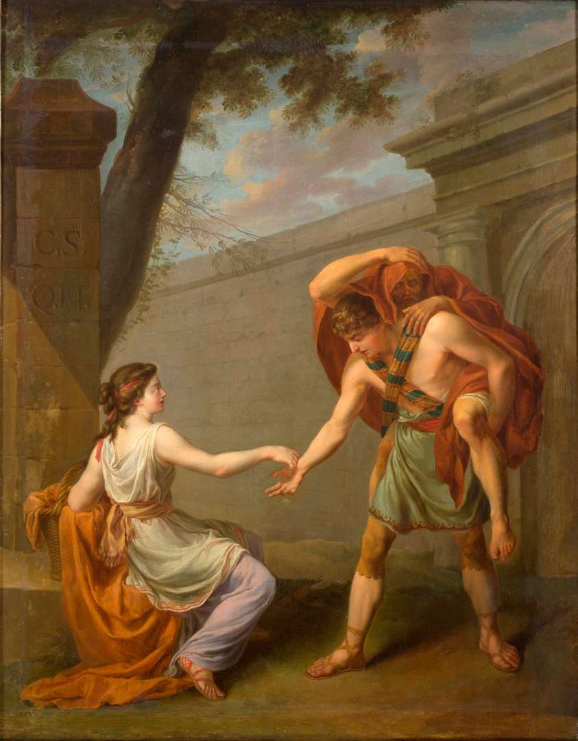 Vien s'inspire ici de l'Enéide de Virgile pour représenter Enée portant son père Anchise sur ses épaules et demandant l'aumône. Sujet dramatique, le peintre choisit de le traiter pourtant d'une manière assez charmante. Les couleurs acidulées et diverses, les poses très élégamment campées contrastent avec les expressions des visages dénuées de gaité en accord avec le sujet. Sans la radicalité dramatique de son futur élève, Jacques-Louis David (1748/1825), le peintre s'attaque à un sujet de l'histoire antique qu'il traite dans une atmosphère antiquisante avec poésie et délicatesse dans la touche.