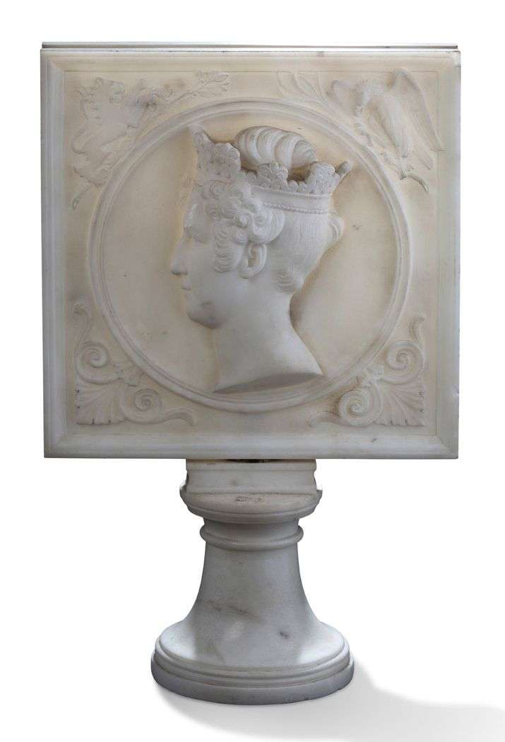 PLAQUE en marbre sculpté sur piédouche orné d'un profil de femme couronnée Ecoinçons ornés de deux palmes, lion et aigle. Sur un piedouche XIXe siècle