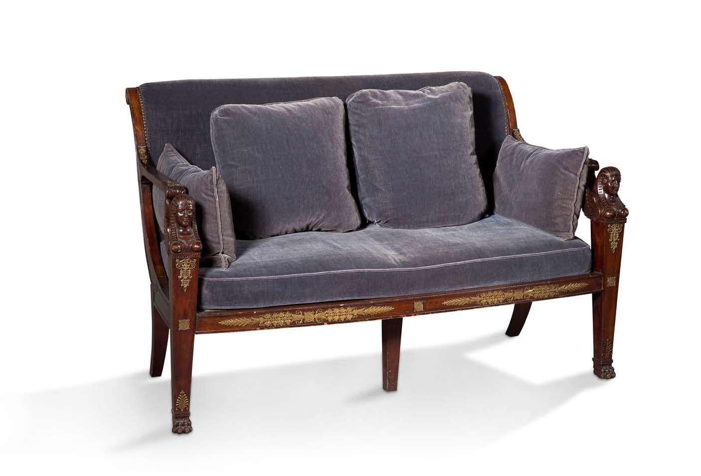 MOBILIER DE SALON en bois teinté, acajou et placage d'acajou à dossier légèrement incliné composé d'une banquette, de six fauteuils et de quatre chaises à dossier incurvé. Pieds antérieurs de forme quadrangulaire terminés par des griffes de lion, pieds postérieurs sabres. Ornementation de bronzes ciselés appliqués tels que : fleurons, palmettes et feuilles de lotus. Les supports d'accotoirs à décor de sphinges ailées. Garniture de velours lavande