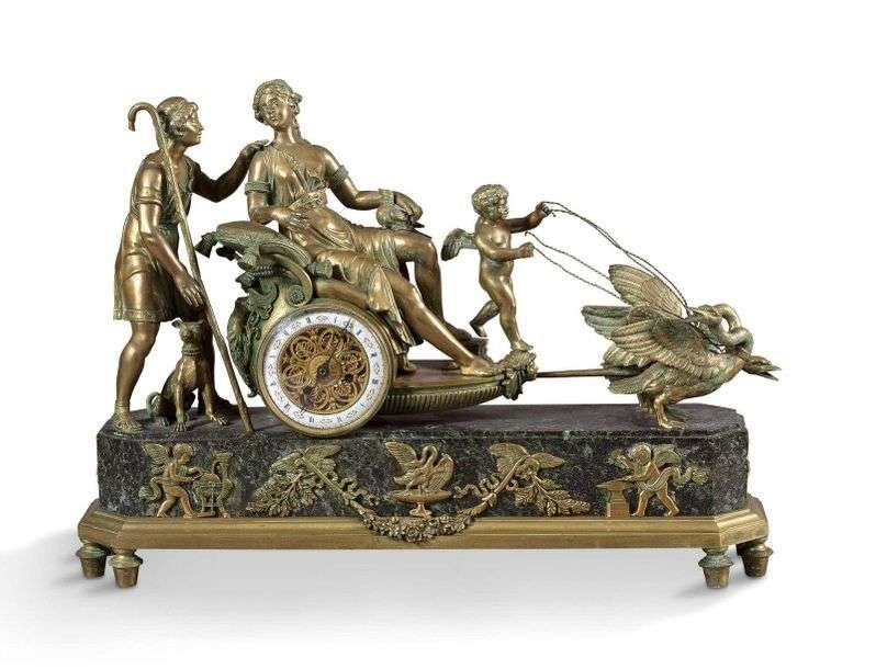 Pendule dite «Elysée» en bronze ciselé et marbre vert de mer représentant le char de Vénus guidé par l'amour et deux cygnes. La pendule présente un cadran en bronze ajouré et en émail blanc noir et or et présente les heures en chiffres romains. La base rectangulaire est supportée par huit pieds toupies et présente un décor en applique de putti ferroniers. XIXème siècle