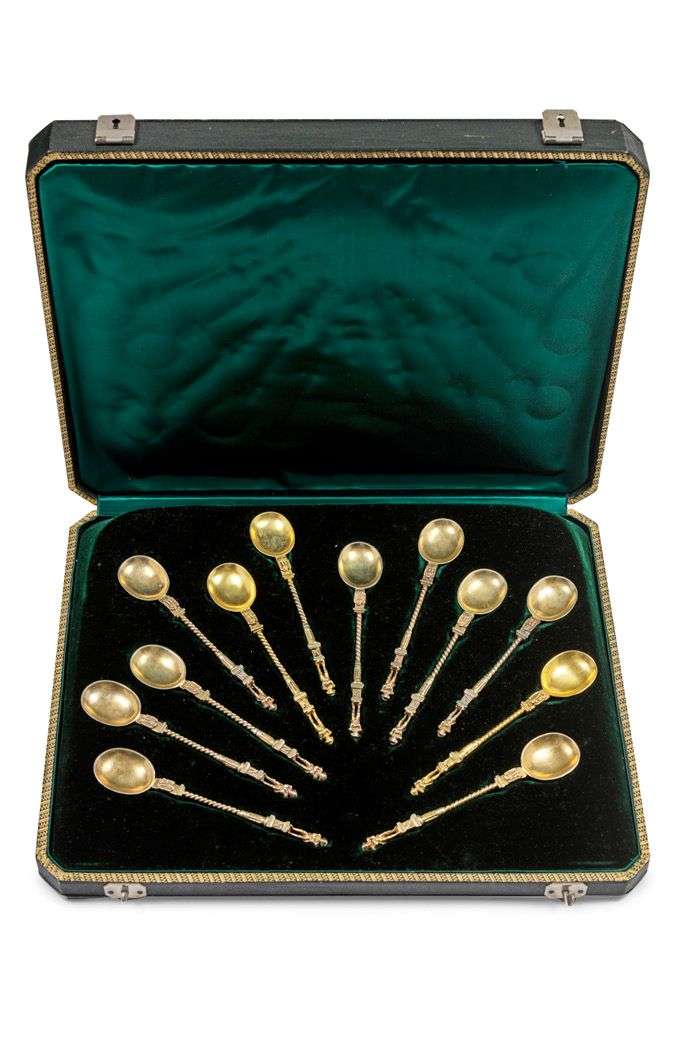 SUITE DE DOUZE CUILLERS À CAFÉ en vermeil, la spatule torsadée est ornée en son extrémité de la figure de Napoléon miniature et d'un aigle. Poinçon d'importation. Dans un écrin en maroquin vert doré aux petits fer orné en son centre du chiffre A.M sous couronne ducale