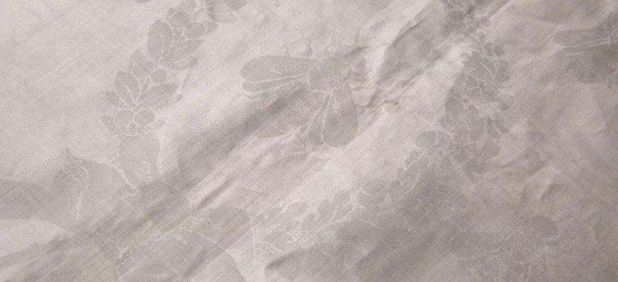 Le décor reprend fidèlement les symboles impériaux employés sur le linge tissé pour les tables du premier Empire.