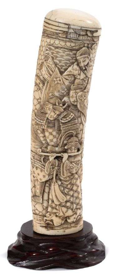 Poignée de sabre en ivoire rehaussé de brun, sculptée en relief de différents personnages, samouraï, musicien, jeune femme, sur fond de pavillons.