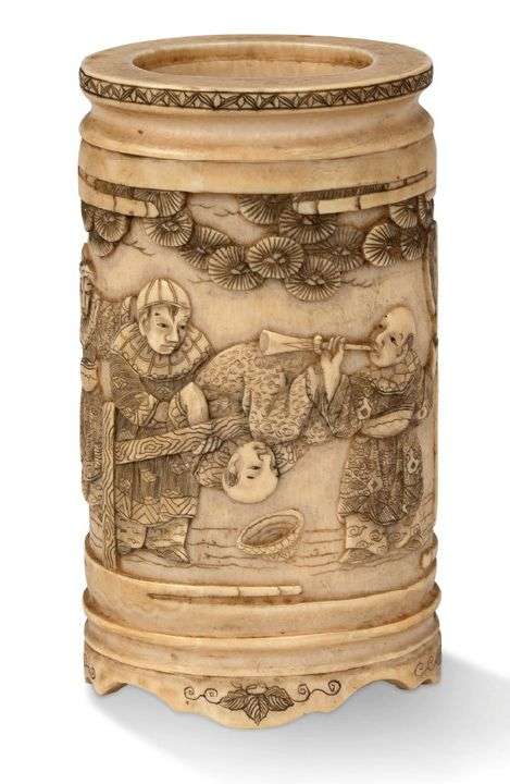 Porte-pinceaux en ivoire sculpté à décor en léger relief de karako, enfants chinois, s'amusant parmi des pins.