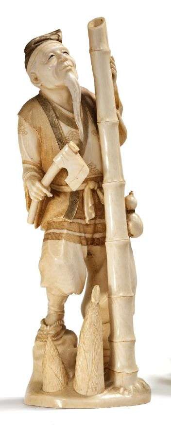 Poignée de sabre en ivoire rehaussé de brun, sculptée en relief de différents personnages, samouraï, musicien, jeune femme, sur fond de pavillons.