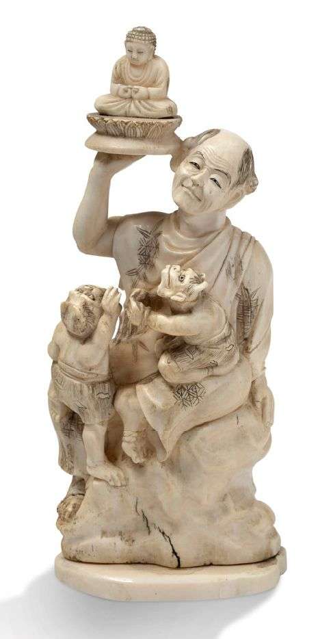 Okimono en ivoire marin représentant un rakan assis sur un rocher, portant une statuette du Bouddha sur sa main droite levée, deux oni à ses côtés tentant de l'atteindre. Signé.