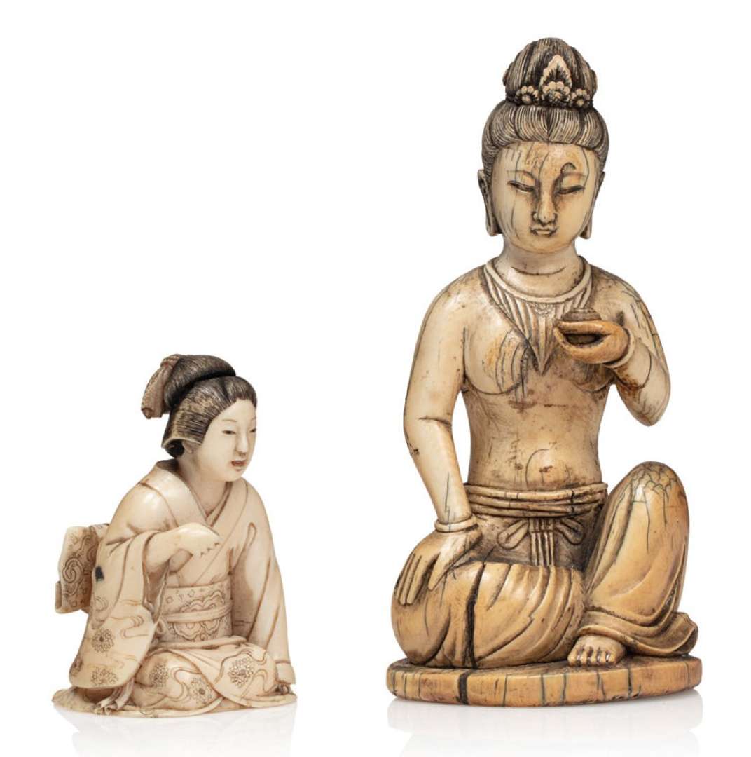 Deux okimono en ivoire, l'un représentant une courtisane agenouillée, qui devait faire partie d'un groupe.