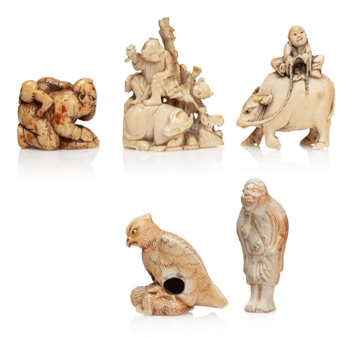 Lot de quatre netsuke dont deux en céramique : rapace sur un singe et Sennin| un en ivoire, représentant un homme sur un buffle et un en ivoire marin représentant