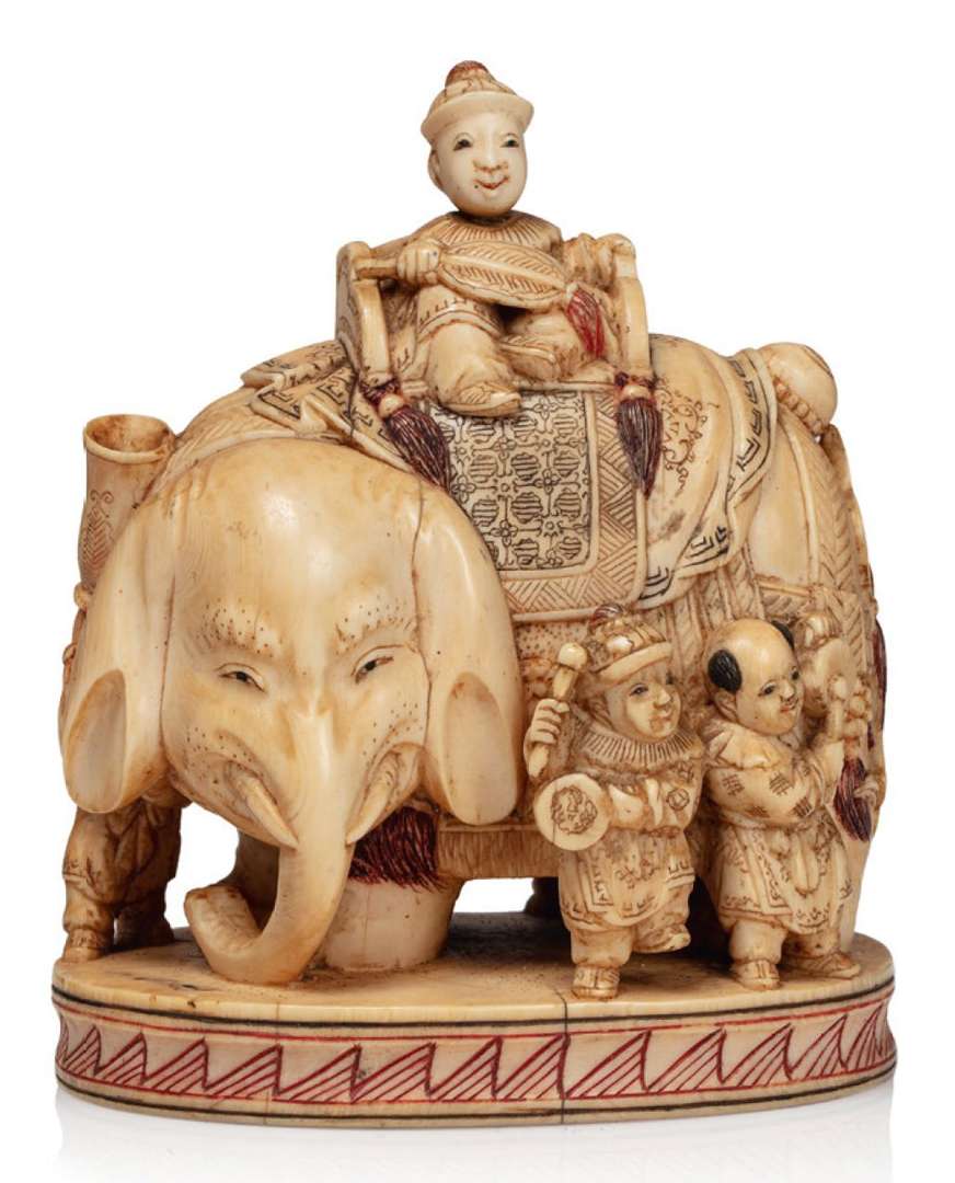 Okimono en ivoire rehaussé de brun et de pigments rouges représentant un éléphant caparaçonné transportant un enfant déguisé en dignitaire et entouré de cinq enfants jouant de la musique, sur une terrasse.