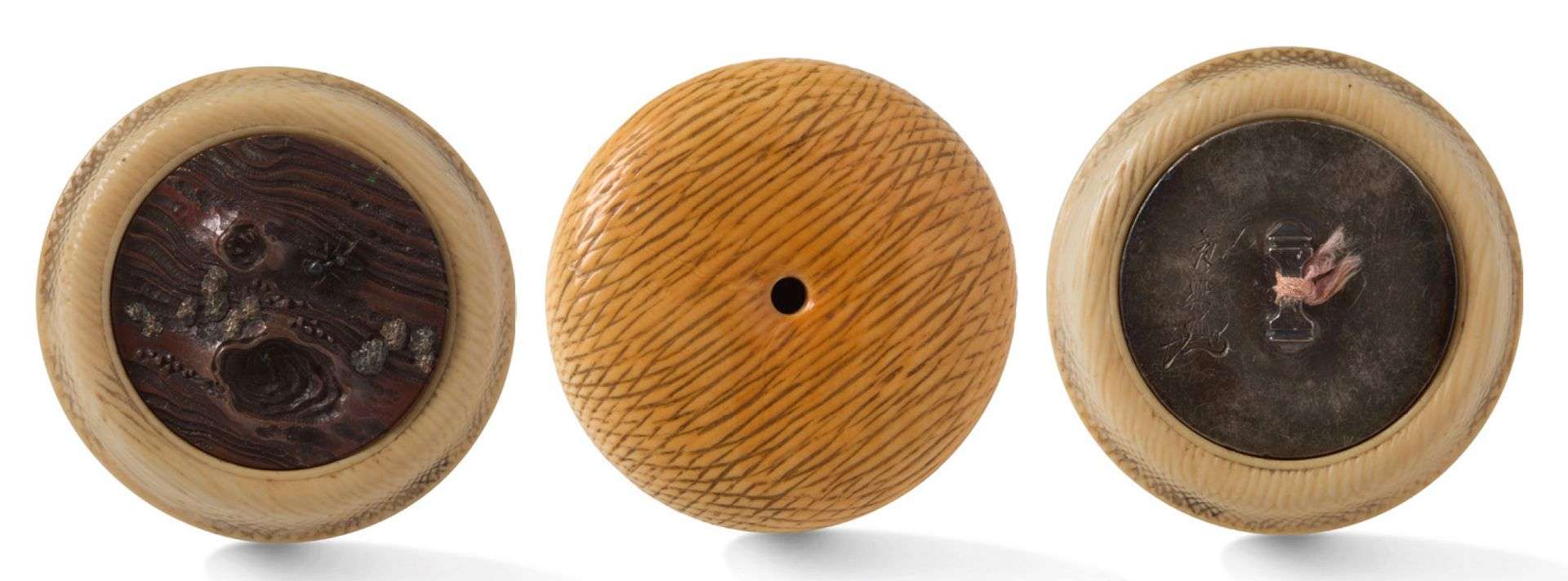 Kagamibuta avec bol en ivoire de forme carénée, traité à l'imitation du bois, la plaque en suaka représentant l'écorce d'un arbre avec ses noeuds, où évoluent deux fourmis en shakudo parmi des lichens en étain partiellement doré.