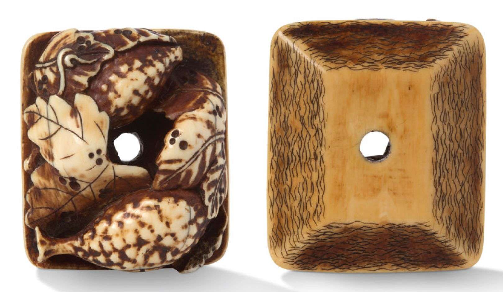 Netsuke en ivoire, légèrement teinté, représentant des grenades et feuillages sur un plateau rectangulaire.