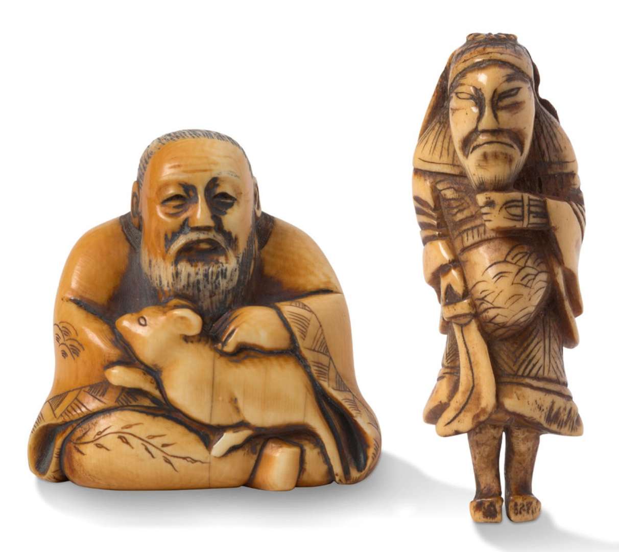 Deux netsuke, l'un en ivoire représentant un sage assis, un animal sur les genou, signé