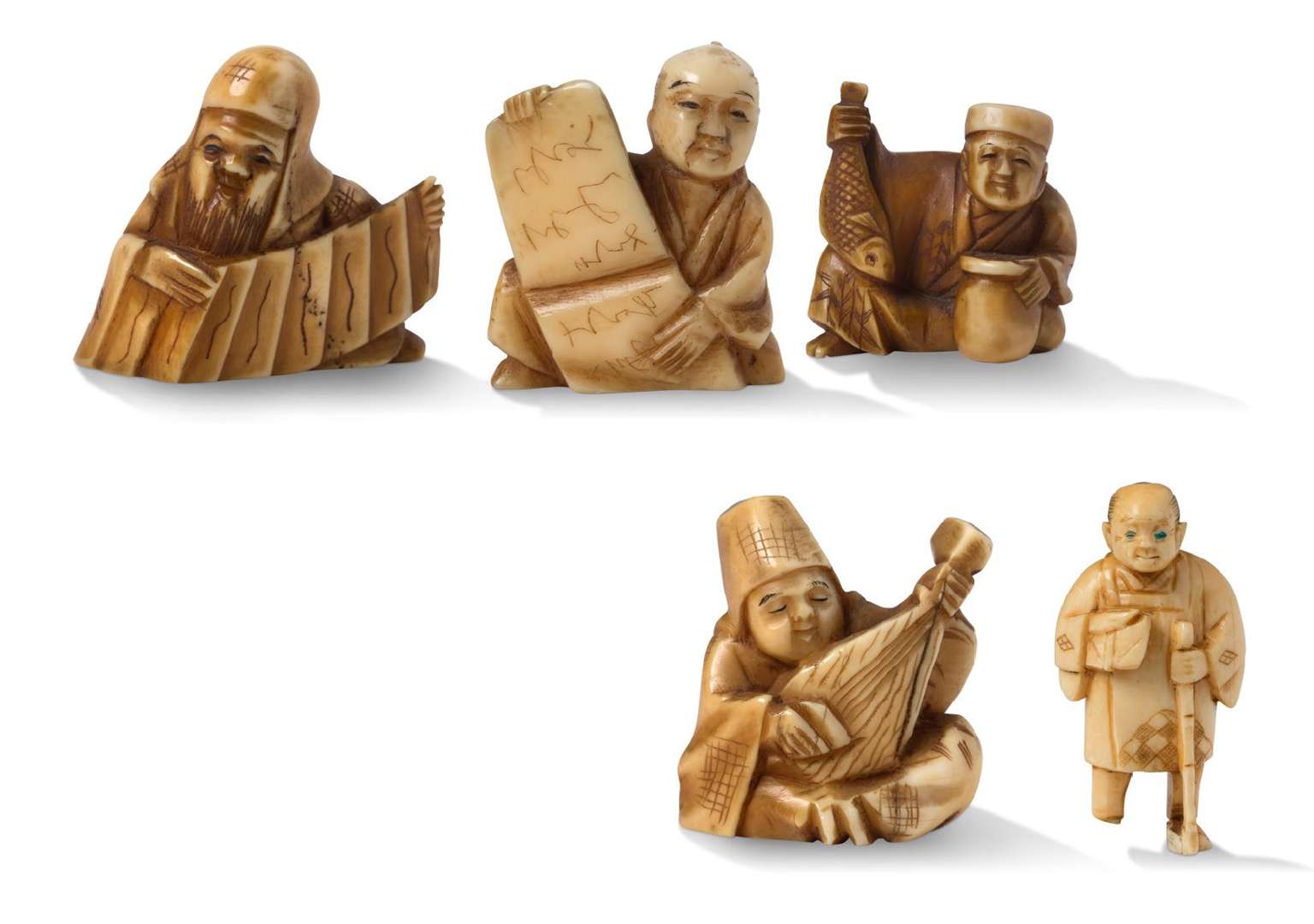 Cinq netsuke en ivoire teinté, représentant respectivement Jurojin assis, tenant une calligraphie| un homme assis déroulant une calligraphie| un marchand assis auprès d'une jarre, tenant un poisson| un musicien jouant du biwa| un homme tenant un bâton.