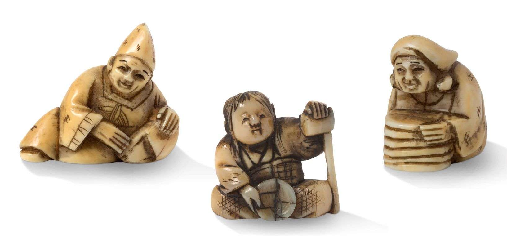Deux netsuke en ivoire marin rehaussé de brun, l'un représentant une Shojo assise, tenant une louche et une coupe à sake| l'autre figurant Daikoku accroupi devant un baquet.