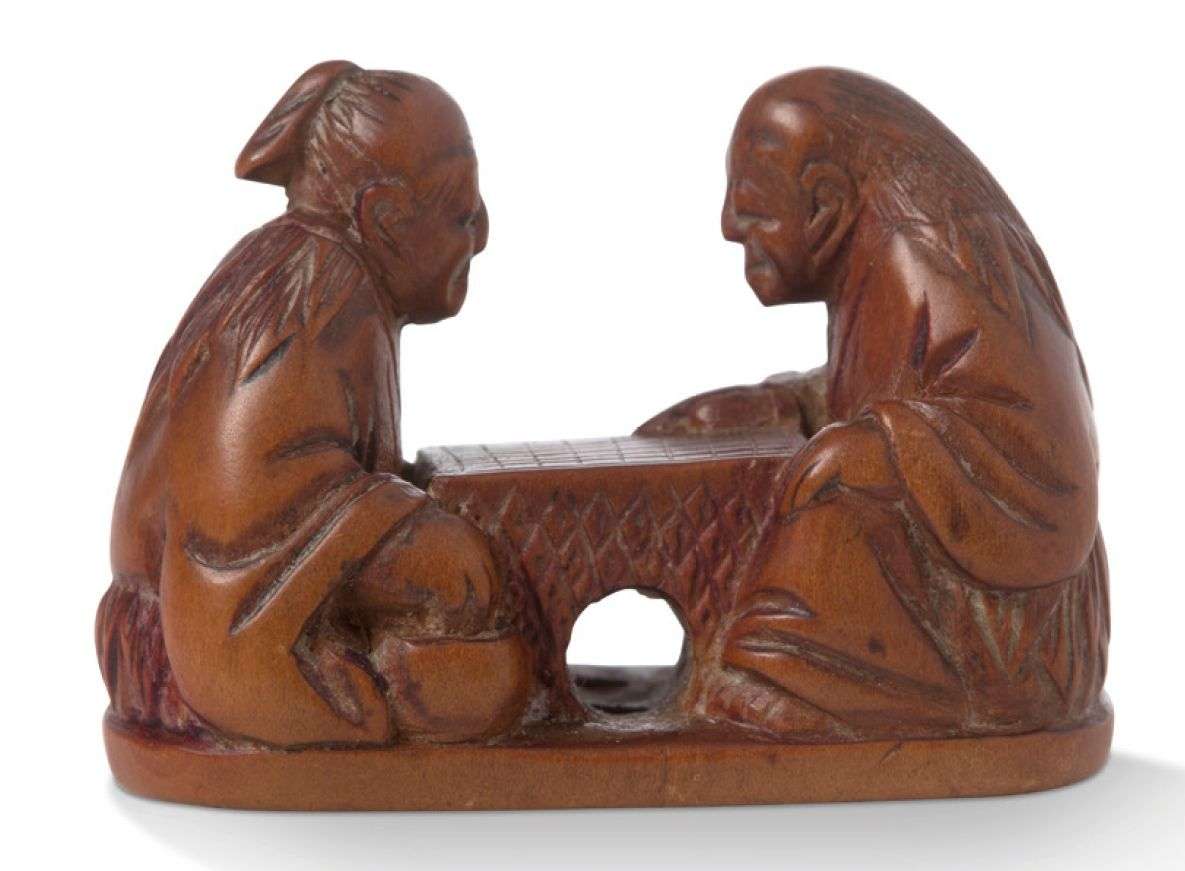 Netsuke en buis, représentant deux Sennin assis face à face, jouant une partie de go.