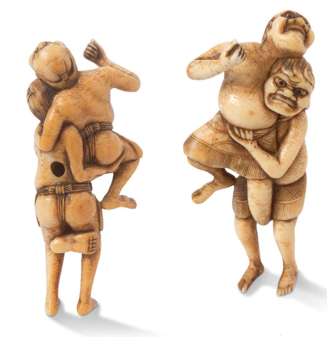 Netsuke en ivoire rehaussé de brun, représentant deux lutteurs de sumo, l'un soulevant l'autre.