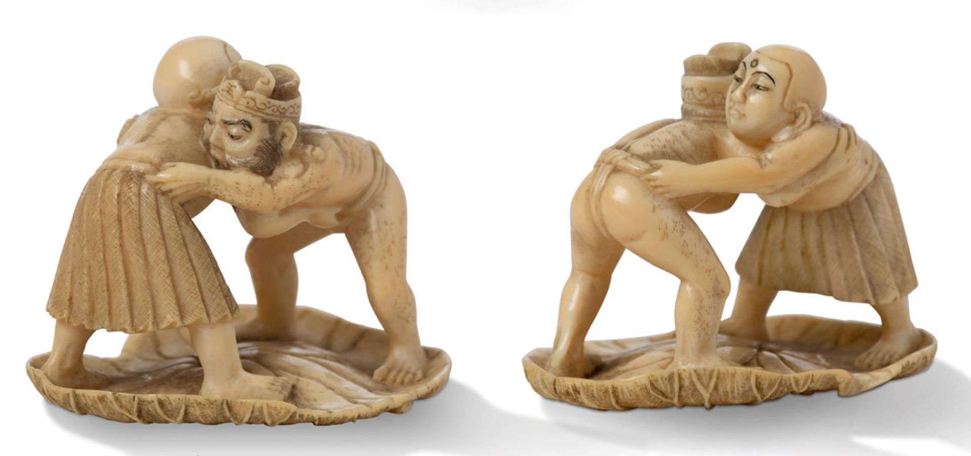Deux petits okimono en ivoire, l'un représentant deux lutteurs sur une feuille de lotus géante, signature cursive au revers de la feuille| l'autre, figurant trois paysans transportant hors des flots un bernard l'hermite géant. Signé Tamayuki.