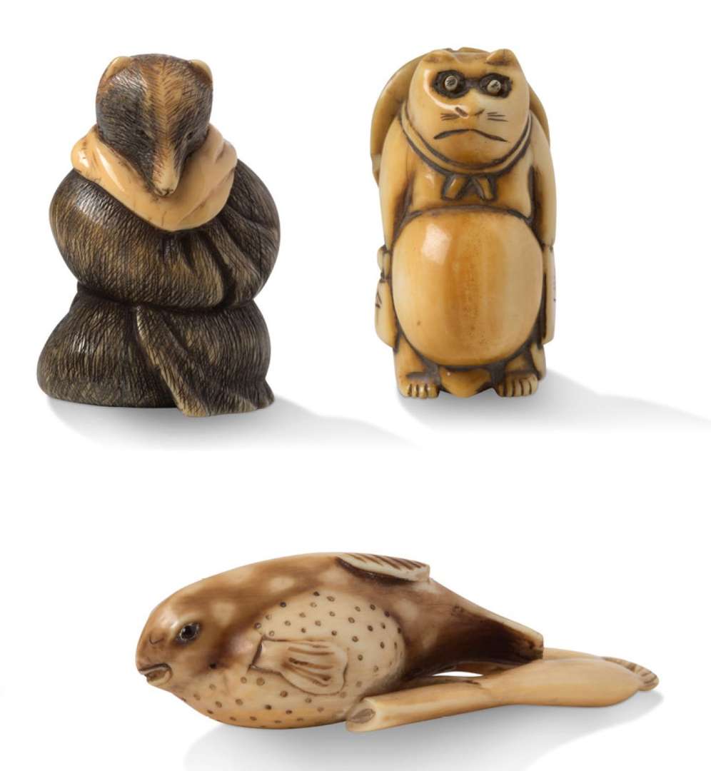 Trois netsuke| l'un en ivoire marin rehaussé de brun représentant Tanuki assis, en robe de moine| les deux autres en ivoire, l'un figurant un Tanuki debout, les yeux mobiles, son chapeau dans le dos, avec signature illisible| l'autre, un poisson fugu sur deux tiges, accolé d'une petite aubergine.