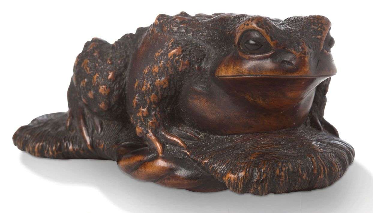 Okimono en bois représentant un crapaud sur une getta, les yeux incrustés de corne brune. Signé Masanao.