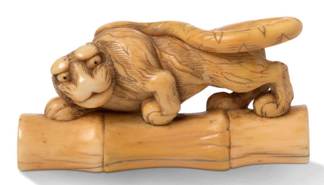 Deux netsuke en ivoire et rehauts bruns, l'un représentant un tigre à l'affut sur une section de bambou| l'autre, trois rats sur un épis de millet, signé Mitsuhiro. Les yeux incrustés de corne brune.