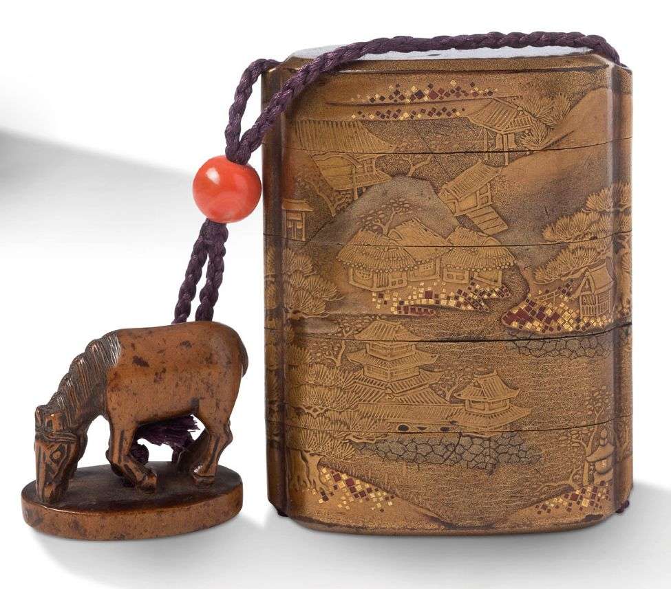 Inrô à quatre cases en laque or à décor en hiramaki-e or, togidashi, kirigane et nashiji, sur les deux faces, de pavillons et pagodes dans un paysage lacustre animé d'un pont.