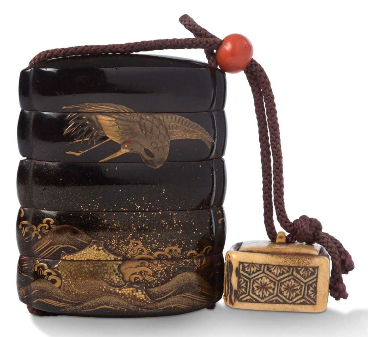 Inrô annelé à quatre cases, de forme dite «Ebi Gata», en bois laqué noir, à décor en hira et takamaki-e or, et kirigane, représentant une grue survolant des vagues écumantes, d'où émerge un rocher sur l'autre face| l'intérieur en laque nashiji et fundame. Ojime sphérique en corail et Hako-netsuke en corne de cerf, de forme carrée, orné de motifs géométriques.