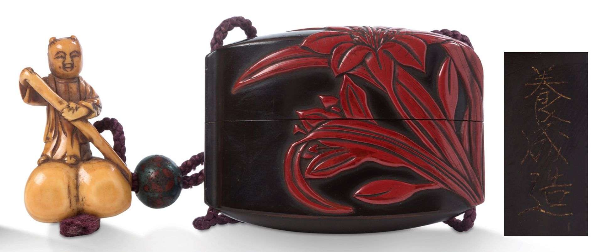 Inrô à une case en laque ro-iro, à décor en laque de cinabre sculpté d'iris et feuillages en haut-relief, signature gravée Yôsei zô.