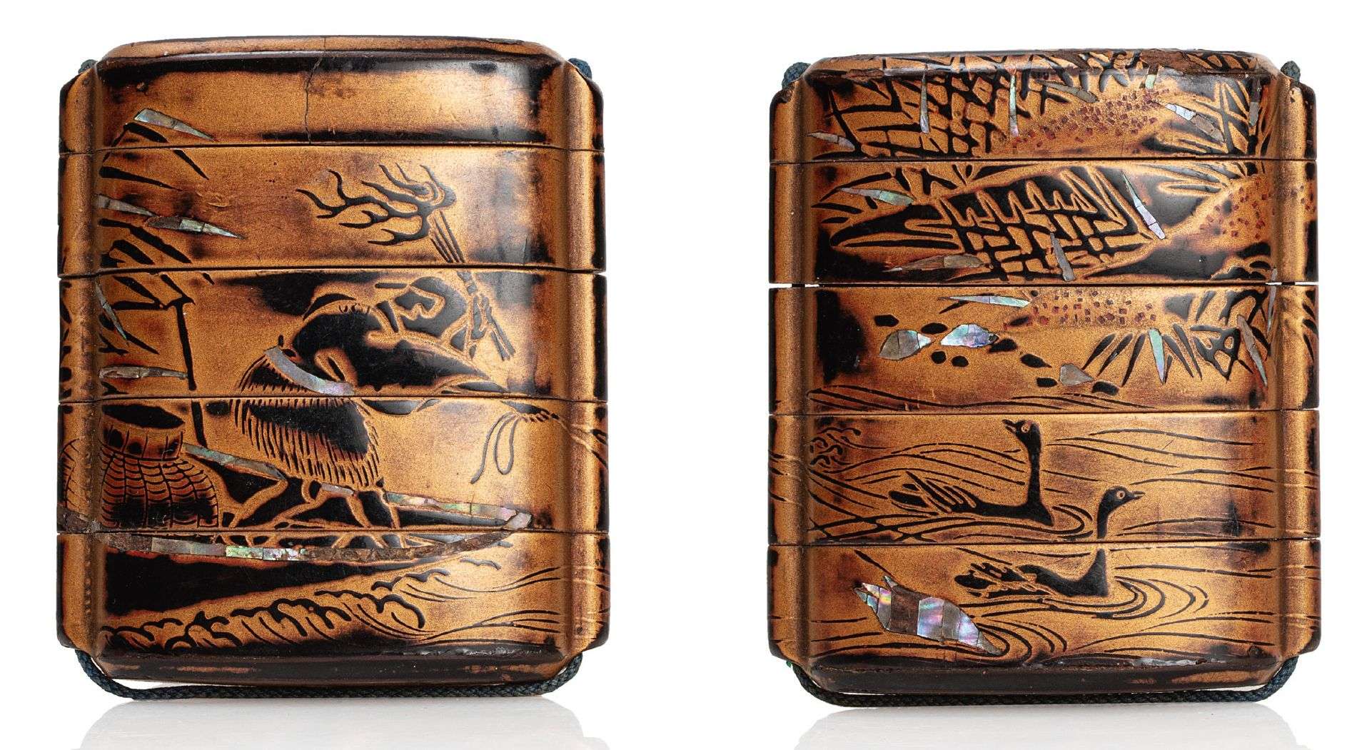 Inrô à quatre cases en laque or à décor incrusté d'aogai d'un pêcheur debout dans sa barque tirée par trois canards qu'il tient par des cordes| l'intérieur laqué noir et fundame.