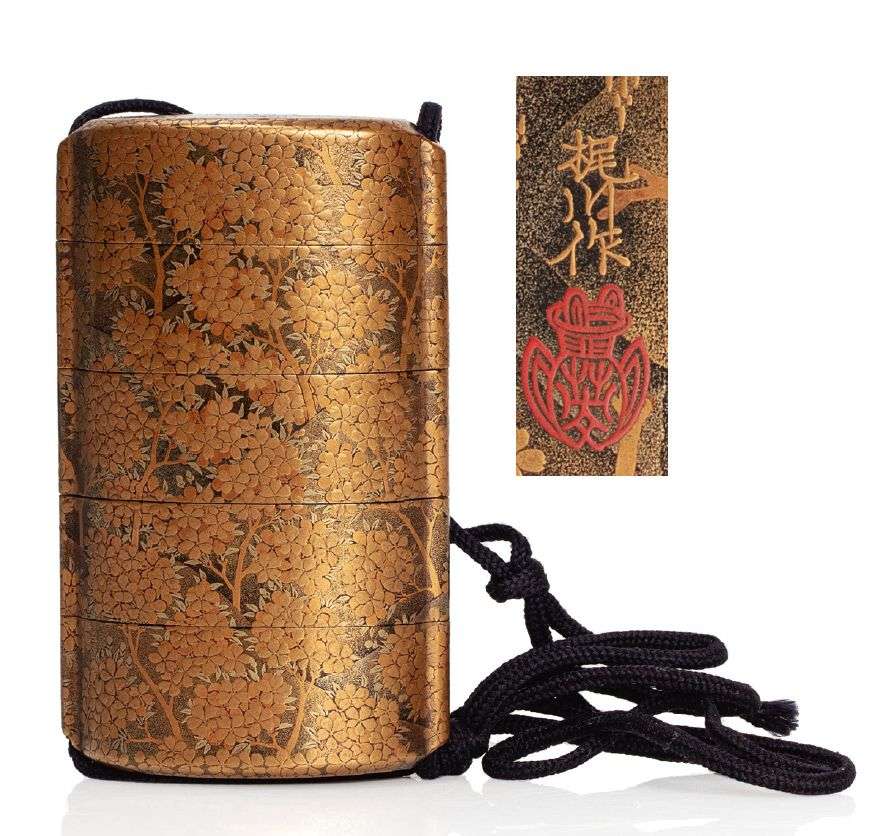 Inrô à quatre cases en laque or, à décor entièrement couvrant de cerisiers en fleurs derrière lesquels on devine des collines en laque nashiji sur fond brun, l'intérieur en laque nashiji et fundame. Signé Kajikawa saku, suivi du vase en laque rouge.