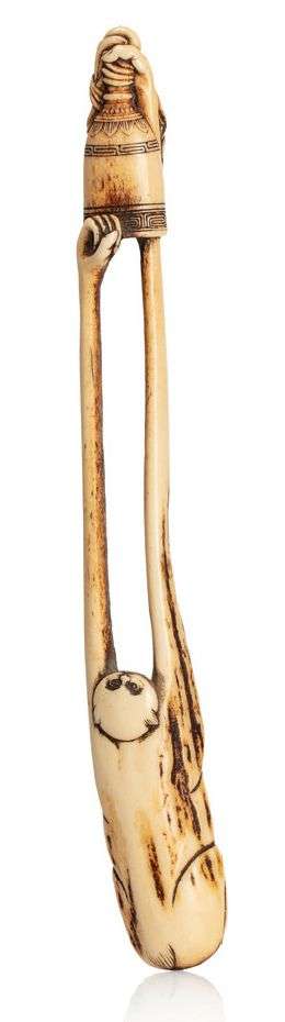 Sashi-netsuke en corne de cerf représentant un singe tenant une cloche au bout de ses longs bras.