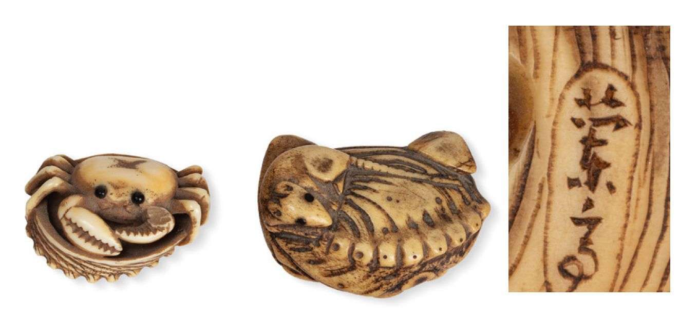 Petit ensemble de cinq netsuke animalier dont deux en ivoire, un en ivoire marin et deux en corne de cerf représentant un crabe sur un ormeau, signé Rantei, un criquet sur deux sections de bambou, un rat sur un ormeau, un moineau vêtu d'un kimino et un sac refermé avec petite poche.