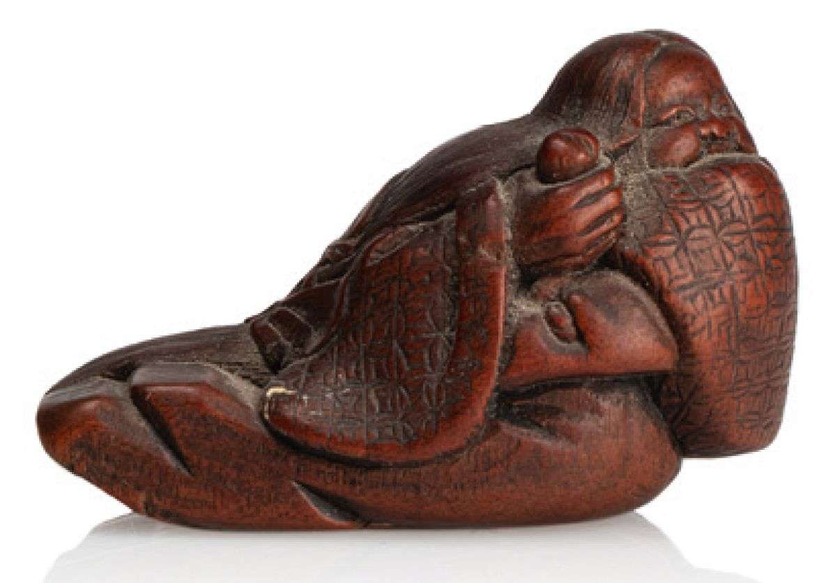 Netsuke en bois représentant Okame allongée, riant dans sa manche. Signé.