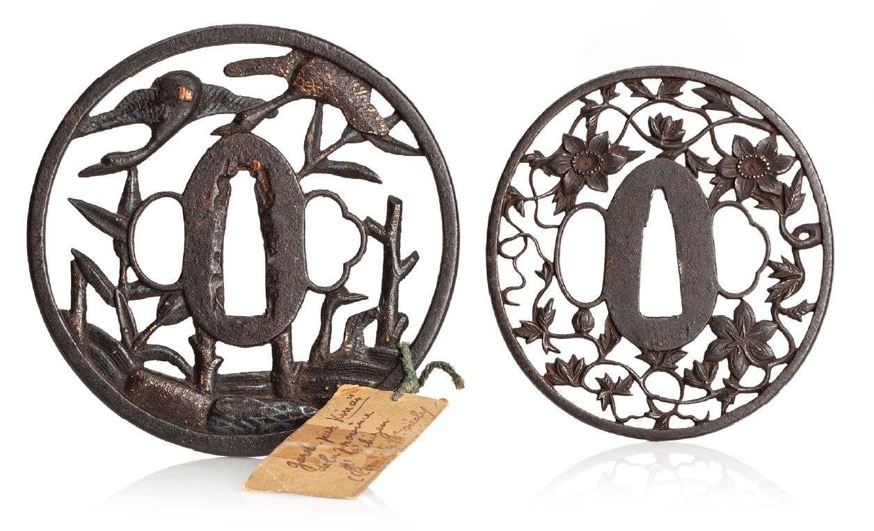 Deux sukashi tsuba en fer, l'une partiellement dorée à décor d'oies en vol au-dessus de roseaux sortant des flots, l'autre ornée de rinceaux de fleurs et feuillages de clématites.