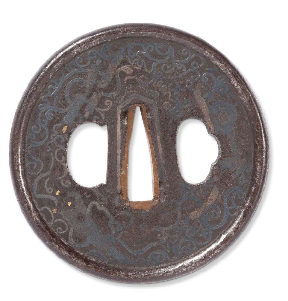 Tsuba maru-gata en fer à décor de karakusa et motifs auspicieux incrustés en étain et rehaussés de touches dorées, le nakago-ana souligné de sentoku, le mimi formant un cercle en haut relief.