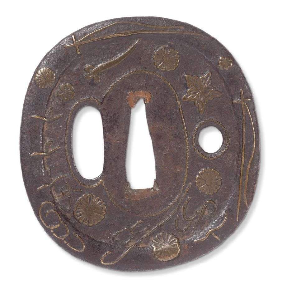 Tsuba en fer, très fine, de forme tatemaru- gata, ornée en incrustations de sentoku, de fleurs et feuilles de paulownia, chrysanthèmes, radis, karakusa, motifs cordés, le mimi formant un large bord.
