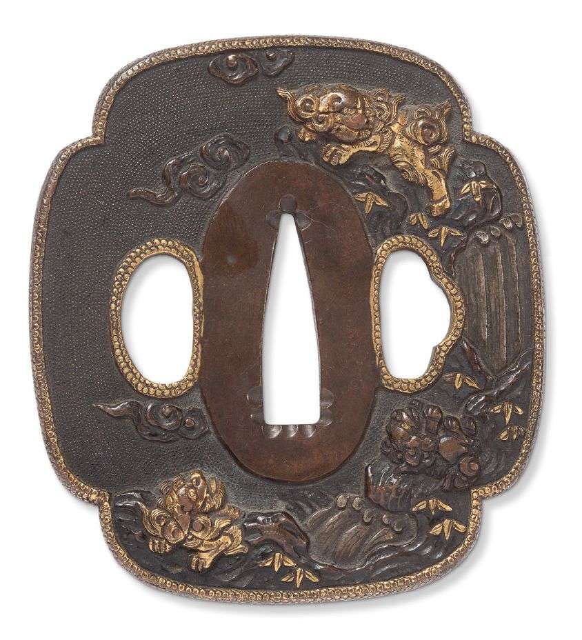 Tsuba mokko-gata en shakudo nanako et rehauts dorés, ornée en takazogan, de trois shishi auprès d'une cascade, deux sur une face, un sur l'autre. Non signée.